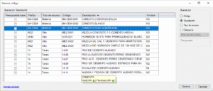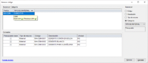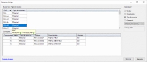 Al ingresar el carácter ? en el campo “Código”, se muestra un cuadro en el que se puede buscar el prefijo que se quiere utilizar. Las búsquedas se pueden realizar por código, descripción, tipo de recurso y categoría.